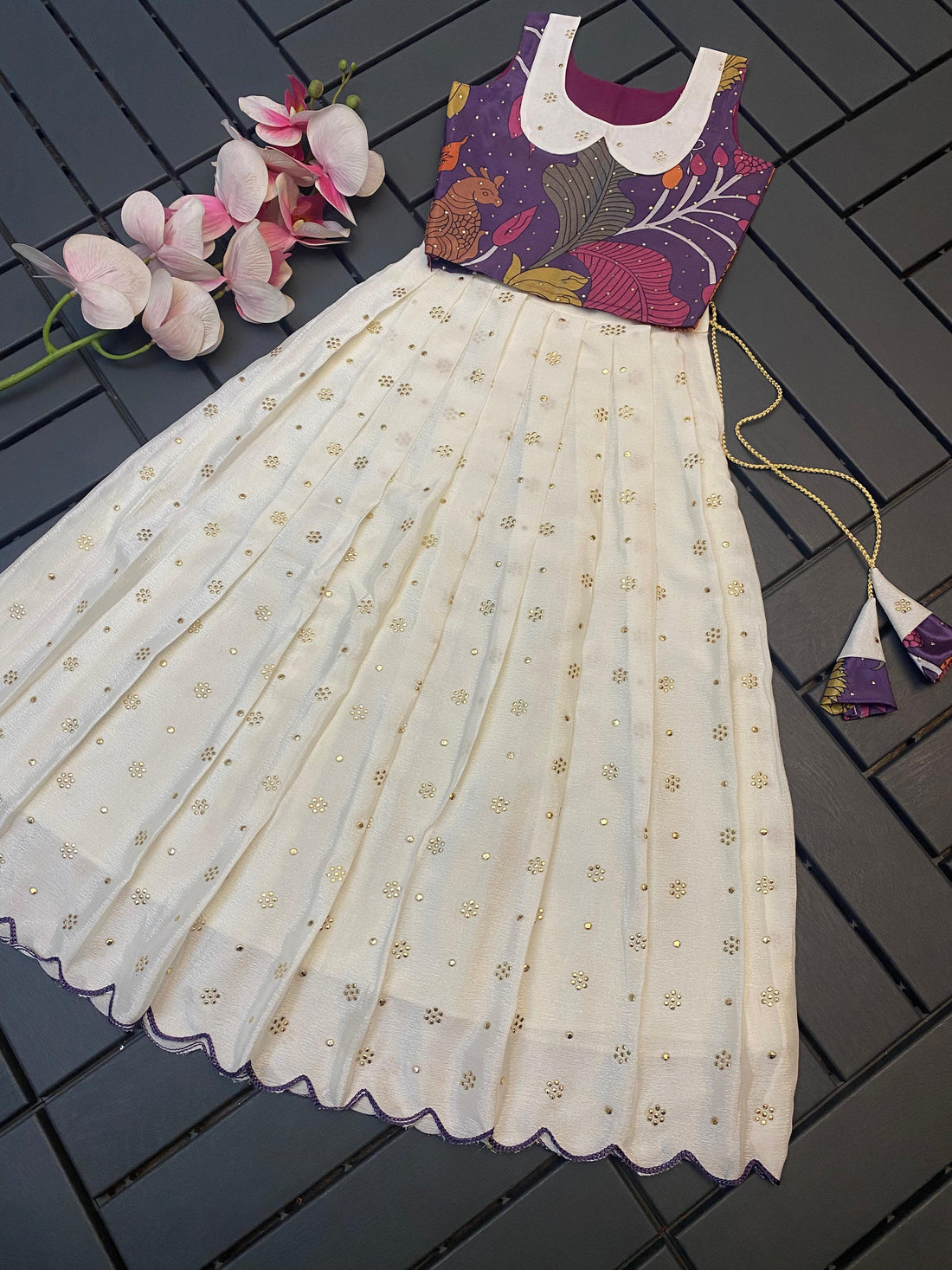 Gown Fabrics: Pure SilkWork: Print & Moti WorkSize: 1 to 16 YearsLining(Inner) : Cotton (full up...