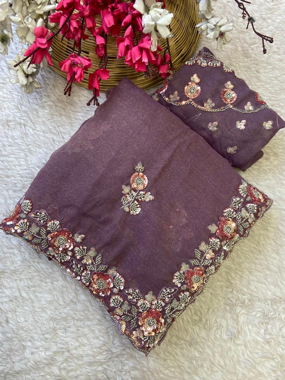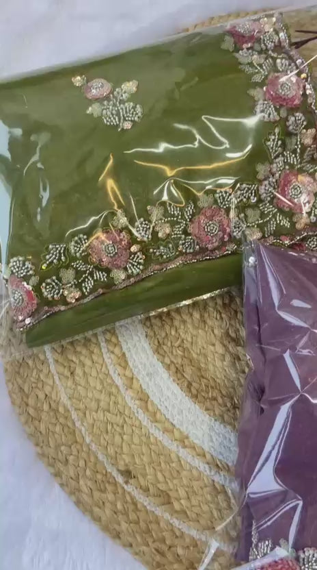 "Pure soft chiffon saree with beads and handwork with proper finishing saree with designer work blouse."