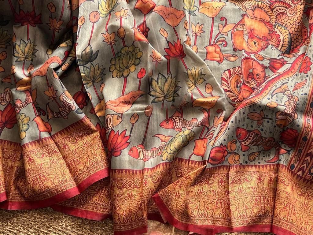 "Linen Digital Print Saree With Kalamkari Print In Full Saree With Fancy Tassels in Pallu With Running Blouse."