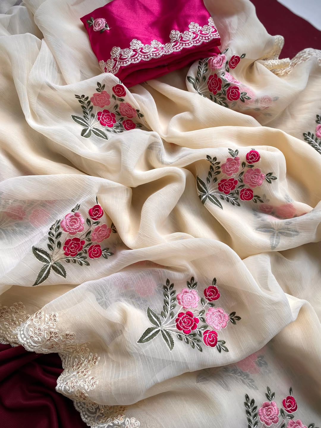 Saree : Goldy crush saree with all over thread embroidery work and sequence embroidery border.