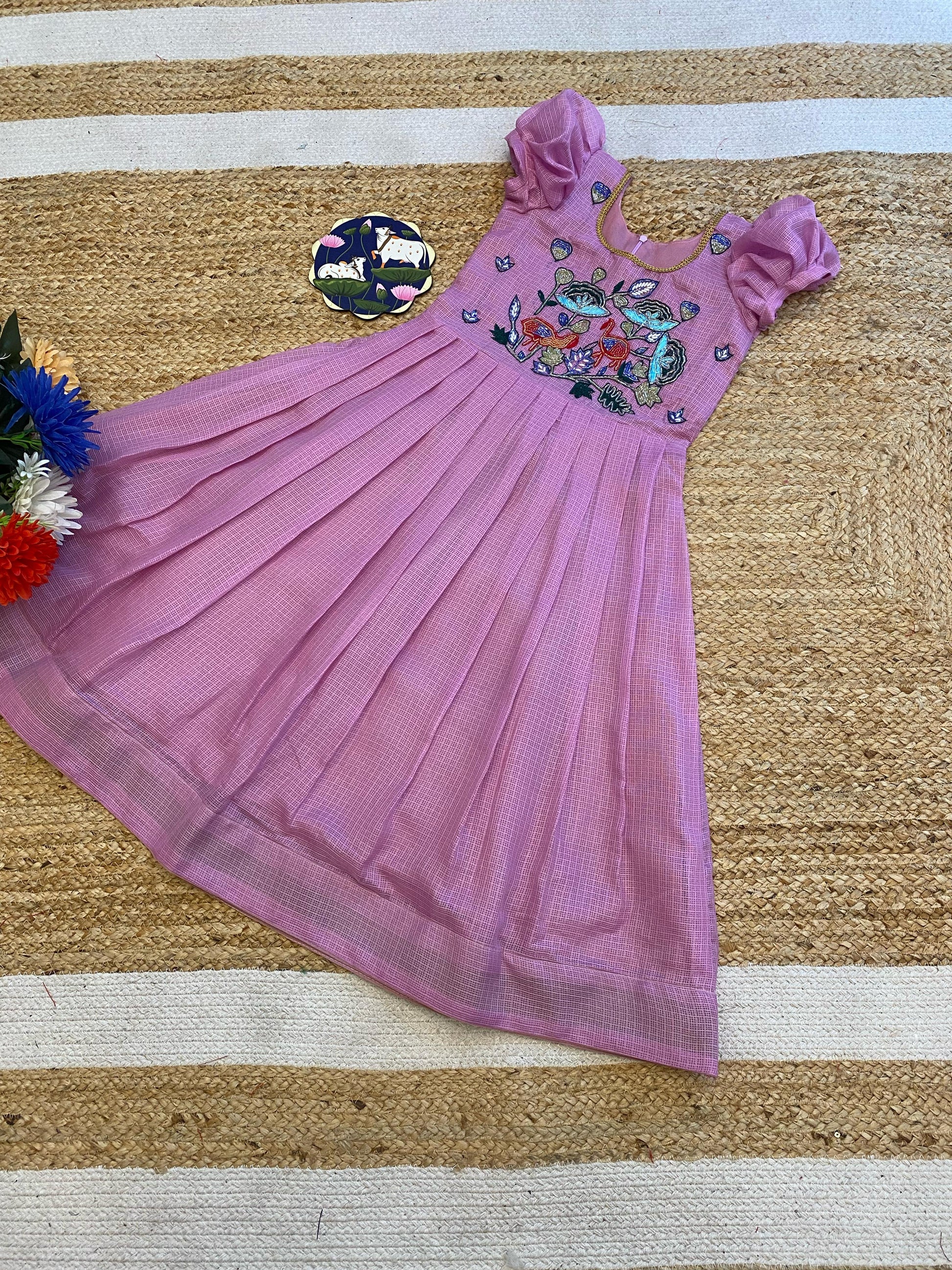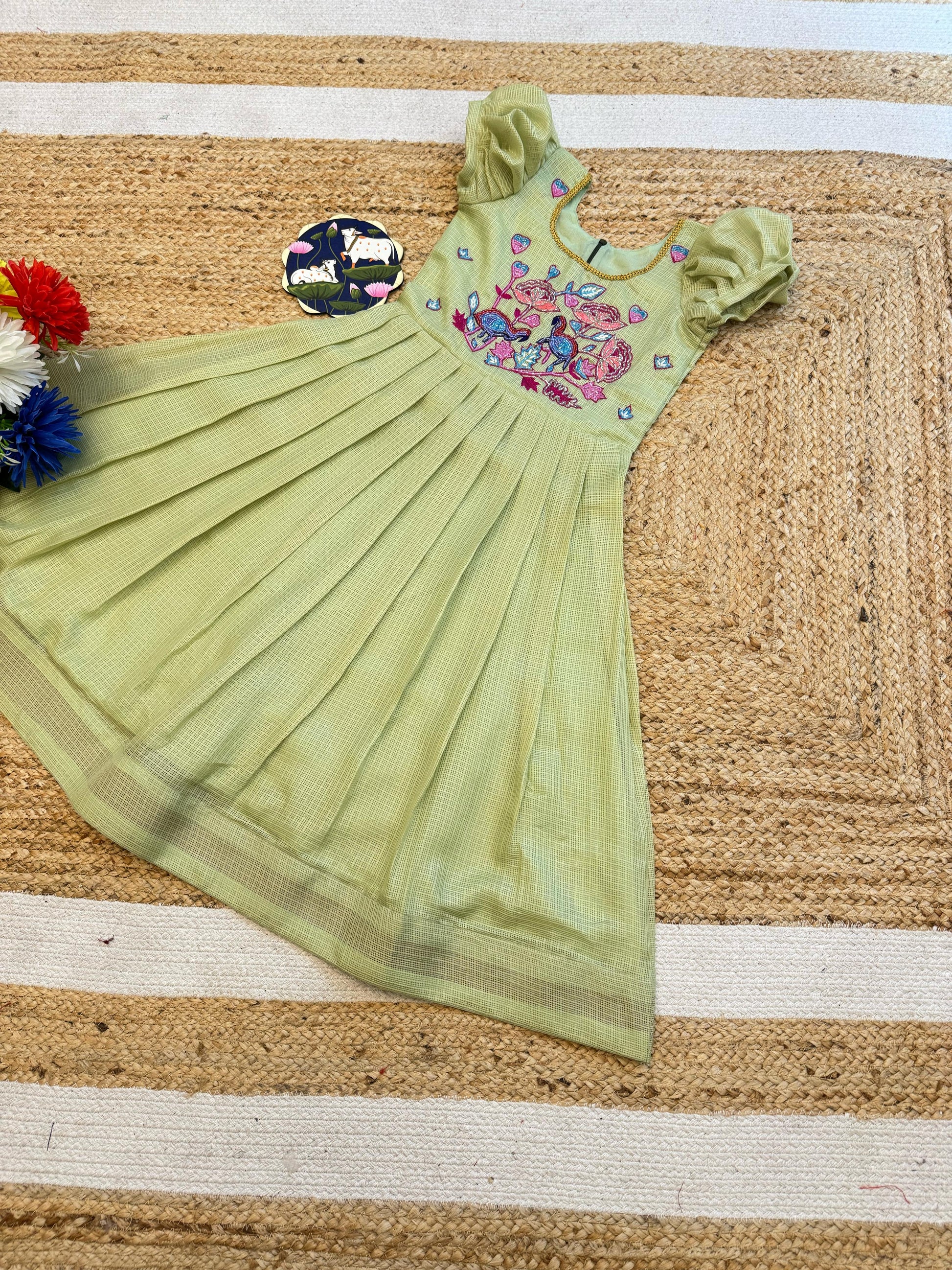 Kota checks Gown For Kids, Gown Soft Kota with Reach Peacock & pasting Katdana Khatli Work Fancy With Fancy Neck Back zip.