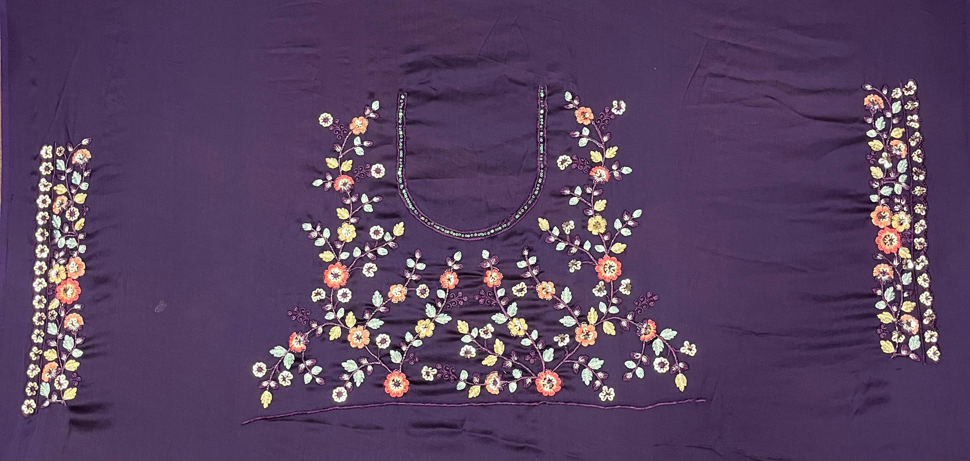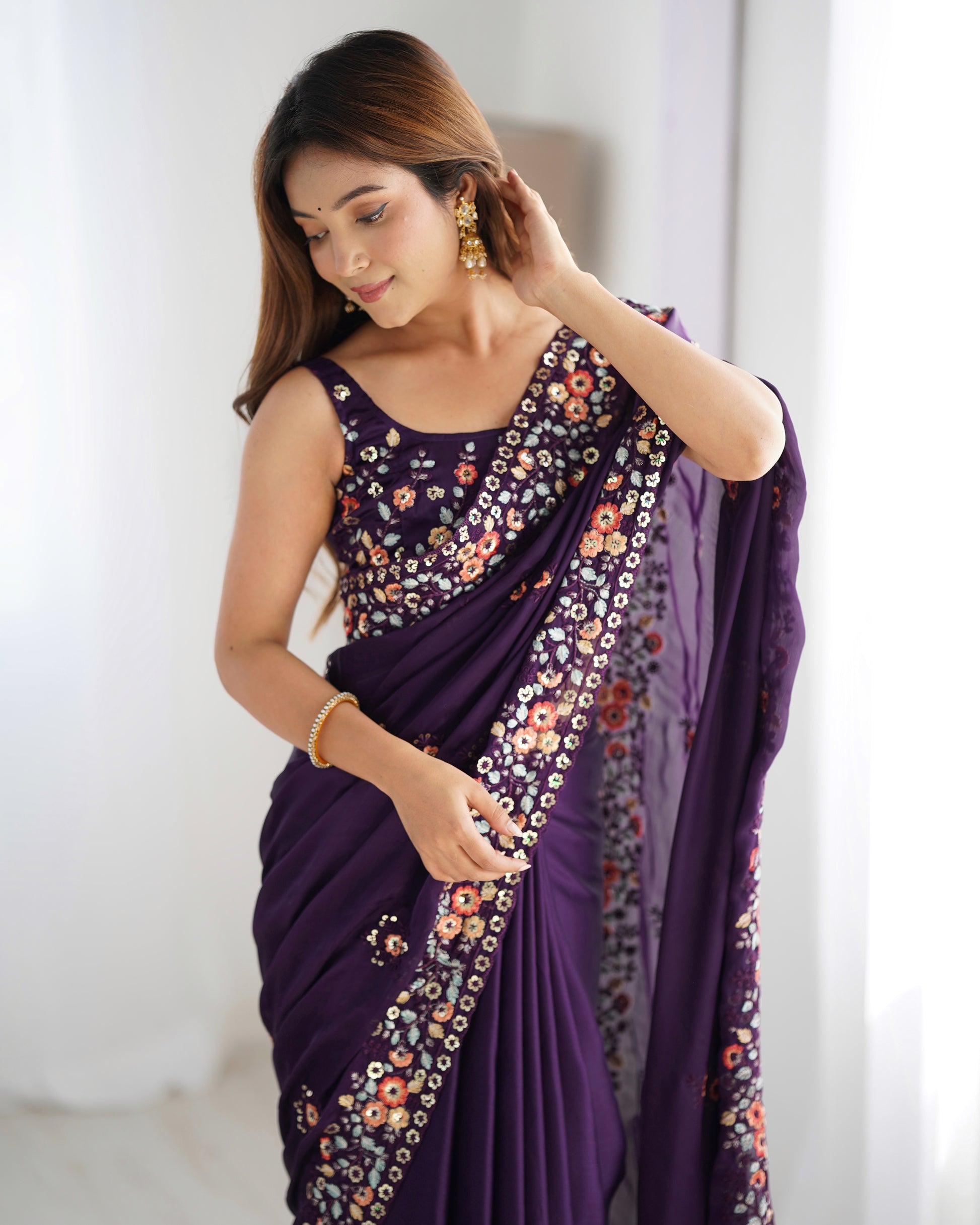 This stunning ensemble is crafted for the woman who loves to stand out with grace. Drenched in a rich, deep purple hue, this saree features a fluid, lightweight drape that flatters every silhouette. The highlight of this masterpiece is the intricate floral embroidery cascading down the borders and across the blouse.