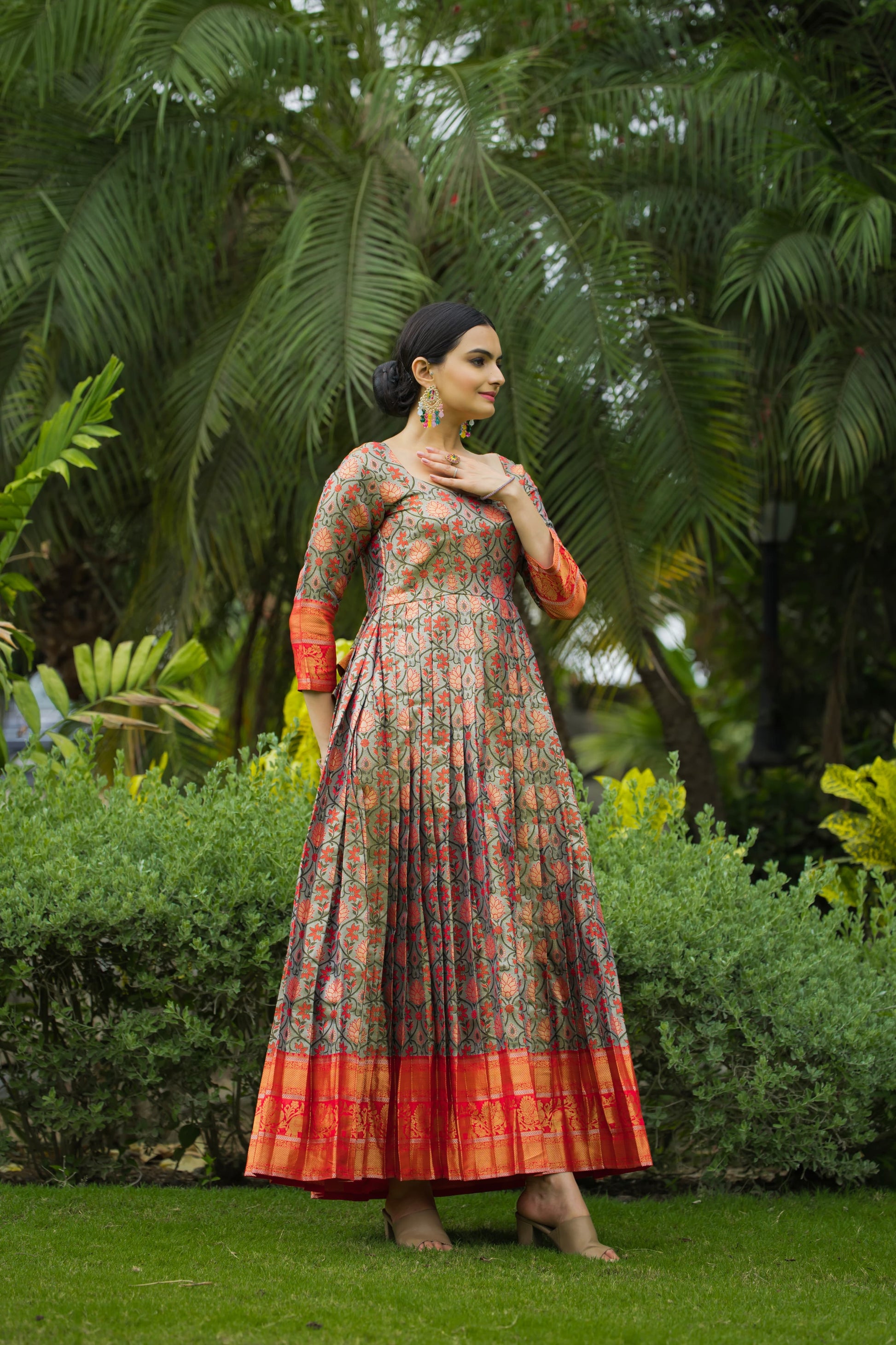 Prepare your wedding wardrobe with semi- kanjivaram silk, featuring a fancy neck , that enhances the look of the outfit. The sleeves come with the same.
