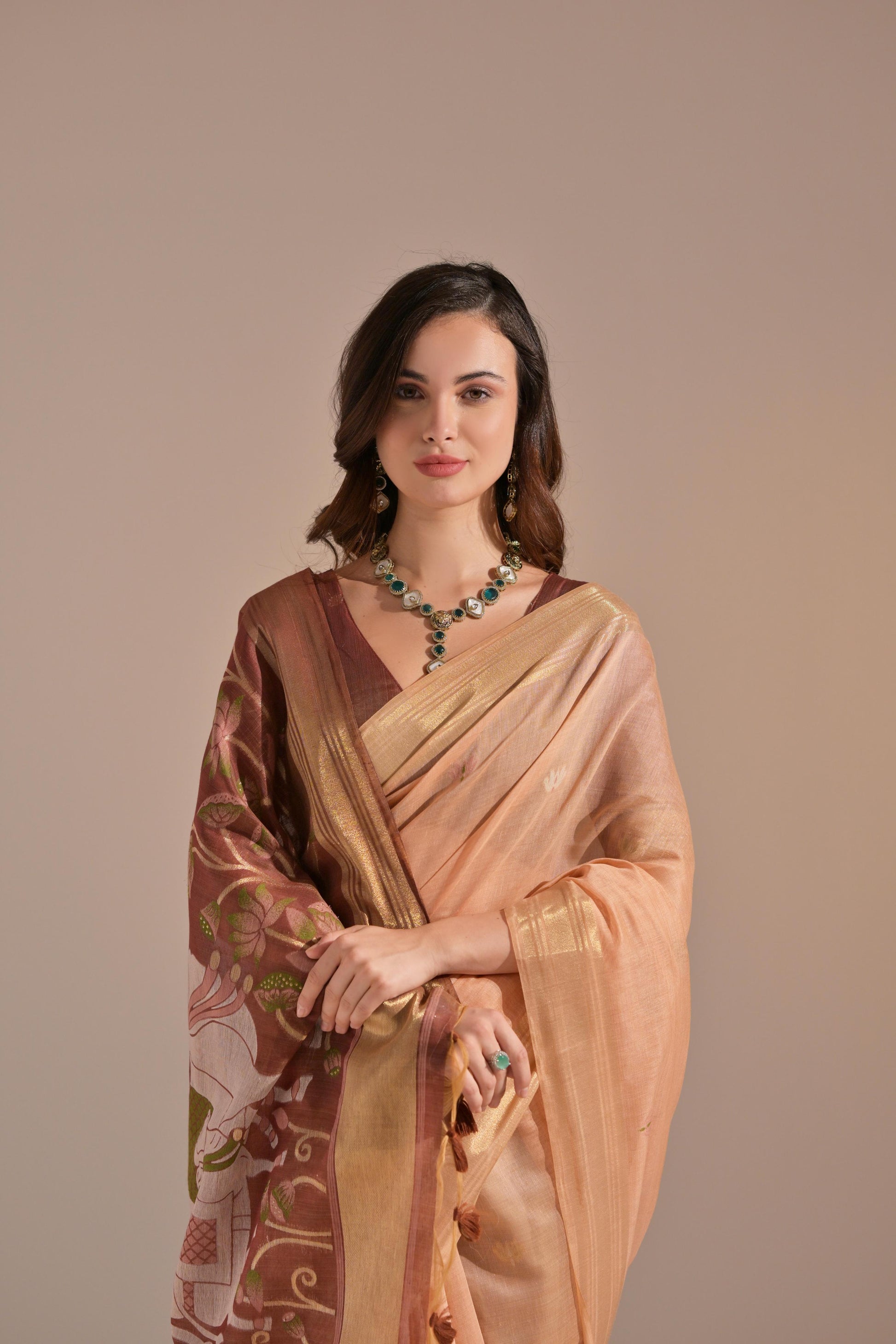 Premium soft Muga Cotton saree with classic colourfull resham weaving pallu in traditional pichwai concept and traditional zari weaving border and all over resham weaving butties and fancy tassels with Contrast blouse piece.